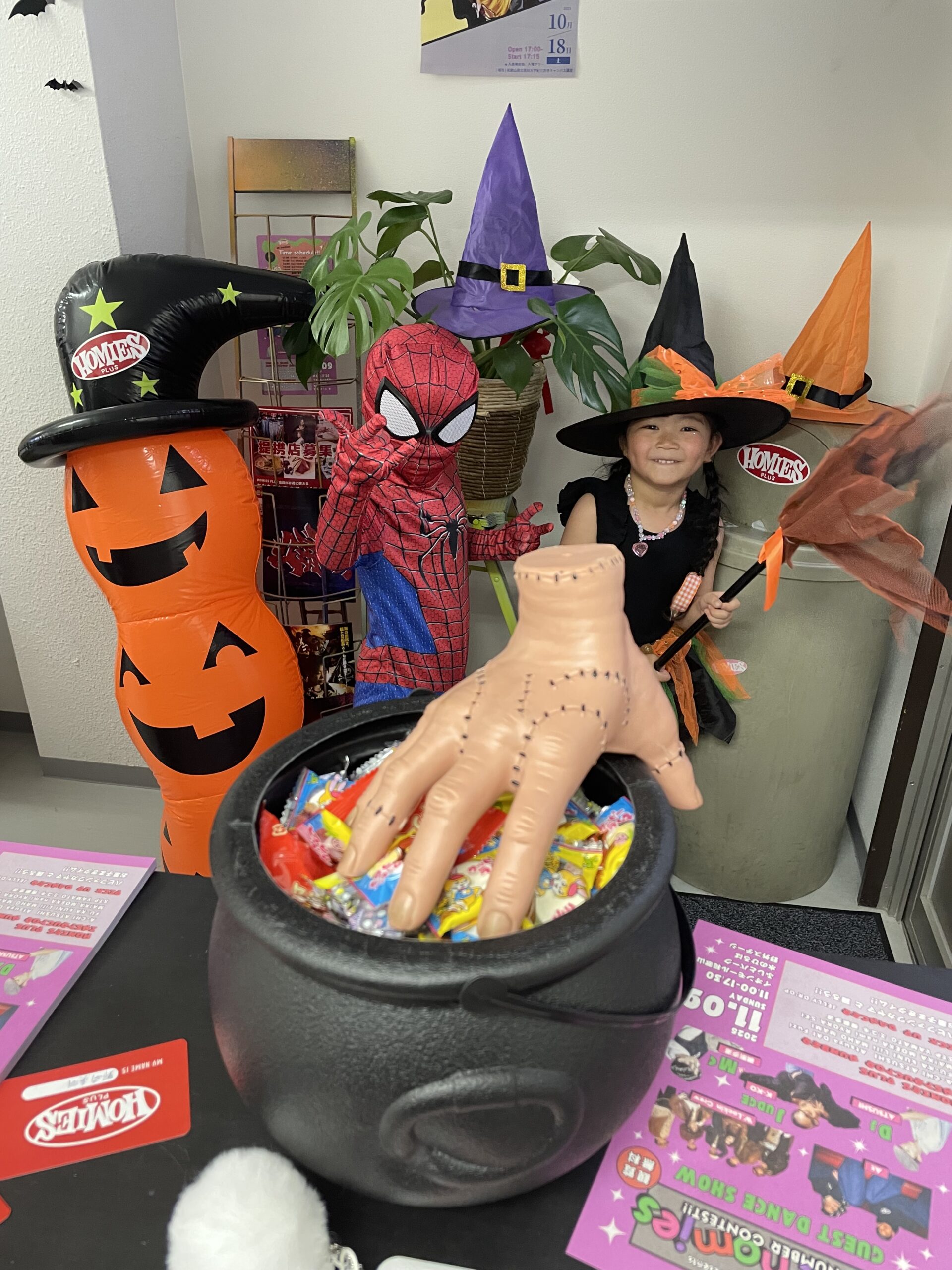皆さんこんにちは🙌HOMIES PLUSも今週から1週間のハロウィンウィークがスタート🎃『本物の』スパイダーマンと、可愛すぎる魔女っ子ちゃんがいたのでパシャリ📷レッスン頑張ったあとは、受付でハロウィンの合言葉『ト○ッ○○○ト○ー○』を言うとお菓子もらえちゃうよ🍭😆